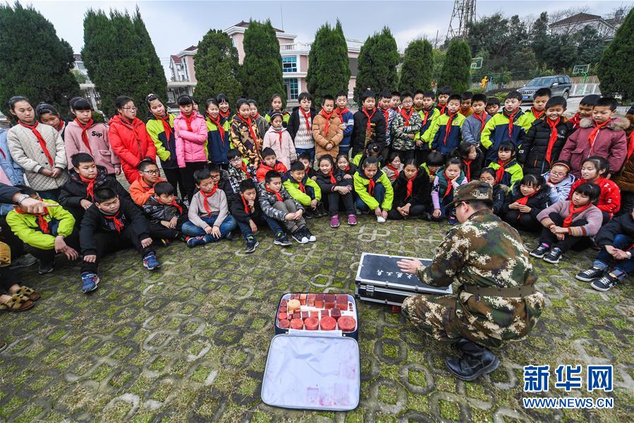 3月6日,东林镇消防应急救援队的队员带领小学生们体验水枪的使用。新华社 记者徐昱/摄