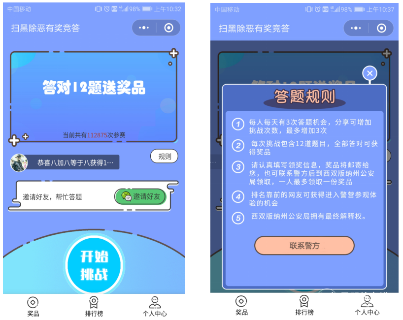参与答题的网友,每人每天有3次答题机会,只需连续答对12题即可领取奖品,奖品为16G“扫黑除恶”U盘卡片,卡片上印有西双版纳警方微信二维码和举报方式,群众获取奖品后,可以产生二次宣传效果,扩大扫黑除恶人民战争的声势。