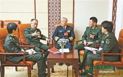 记者邹维荣(右一)、柴华(左一)采访军队政协委员郝万禄(左二)、岑旭(中)、张辉(右二)。中国军网记者 孙智英摄