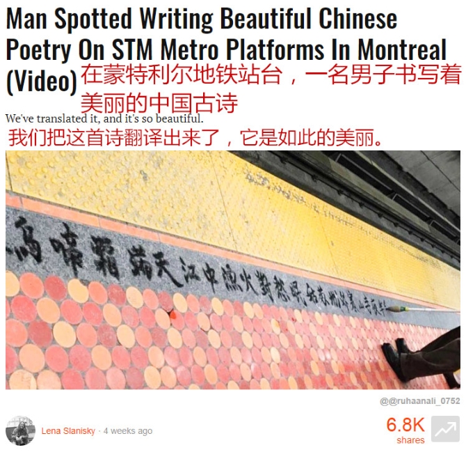 MTL Blog 的编辑称,蒙特利尔以其艺术氛围而闻名, 因此,听到有人在Lionel-Groulx地铁站台上写了一首诗,他们并不感到惊讶......但是当发现这首诗是用汉语书写的时候,他们瞬间来了兴趣。