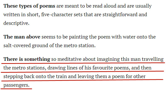 MTL Blog还给这名老大爷的做法进行了诗意的解读:“想象这个人在地铁站短暂停留,一笔一划书写出他最喜欢的诗,然后回到车上,给其他乘客留下了一首诗,这真是引人遐想。”