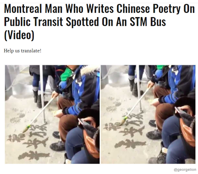对于这位大叔的再次现身,“MTL Blog”是这样报道的:”你可能还记得我们几周前报道了一名男子在Lionel-Groulx地铁站用水写中国诗的事儿。