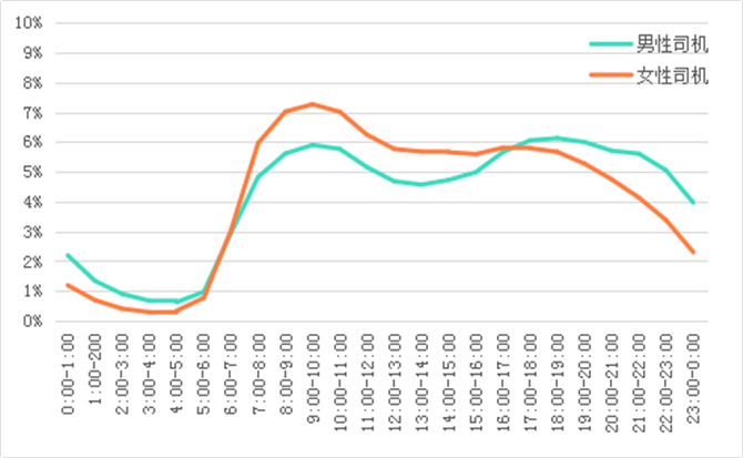 同时,网约车新就业灵活的工作方式,也能满足女性照顾家庭的需求。报告显示,多数女性司机17点后回归家庭;而男性司机多集中在早晚高峰两个时段接单,特别是在夜间时段男性司机比例远远高于女性司机。