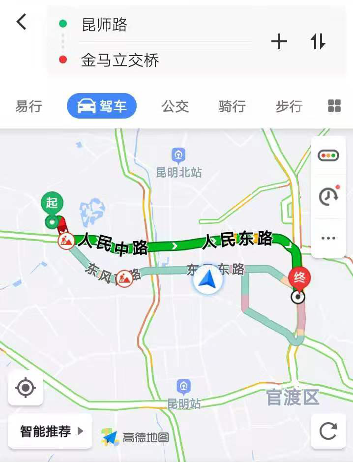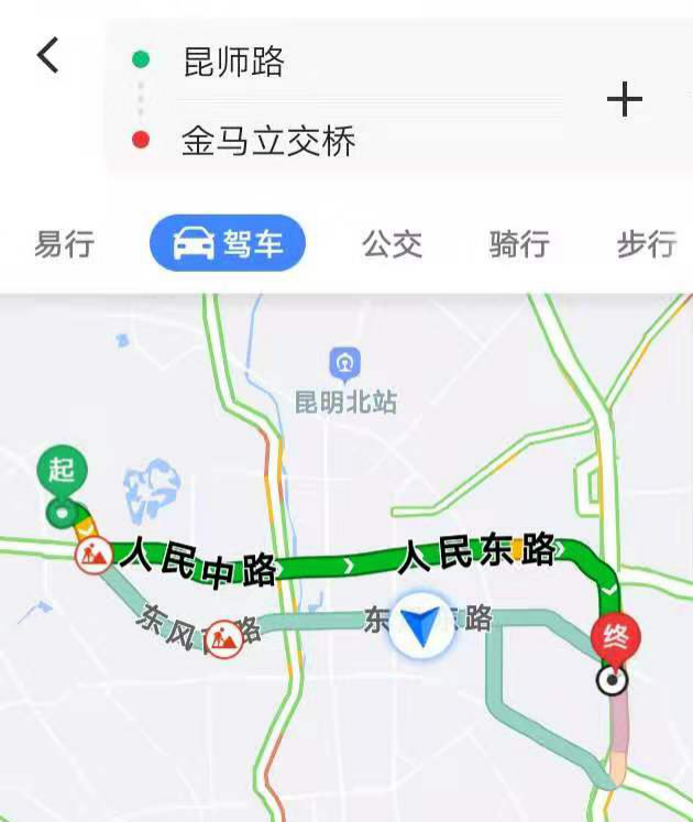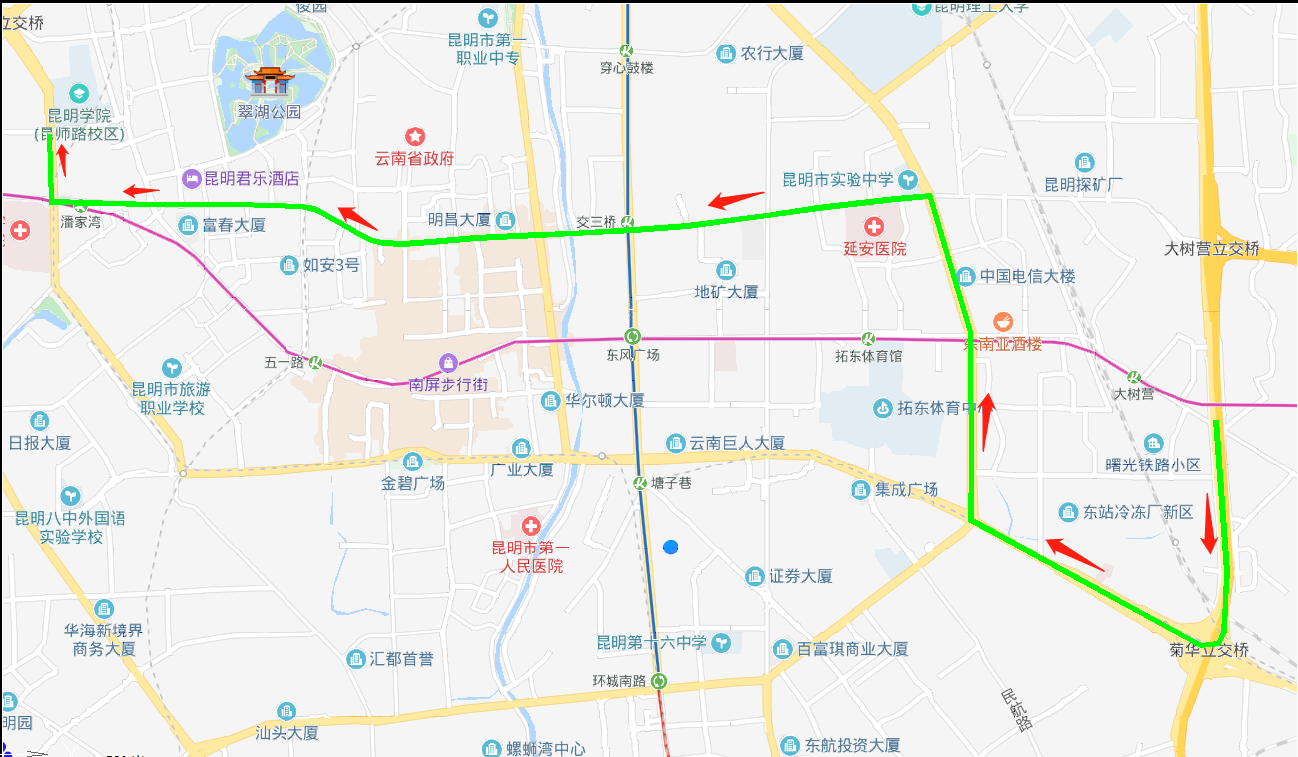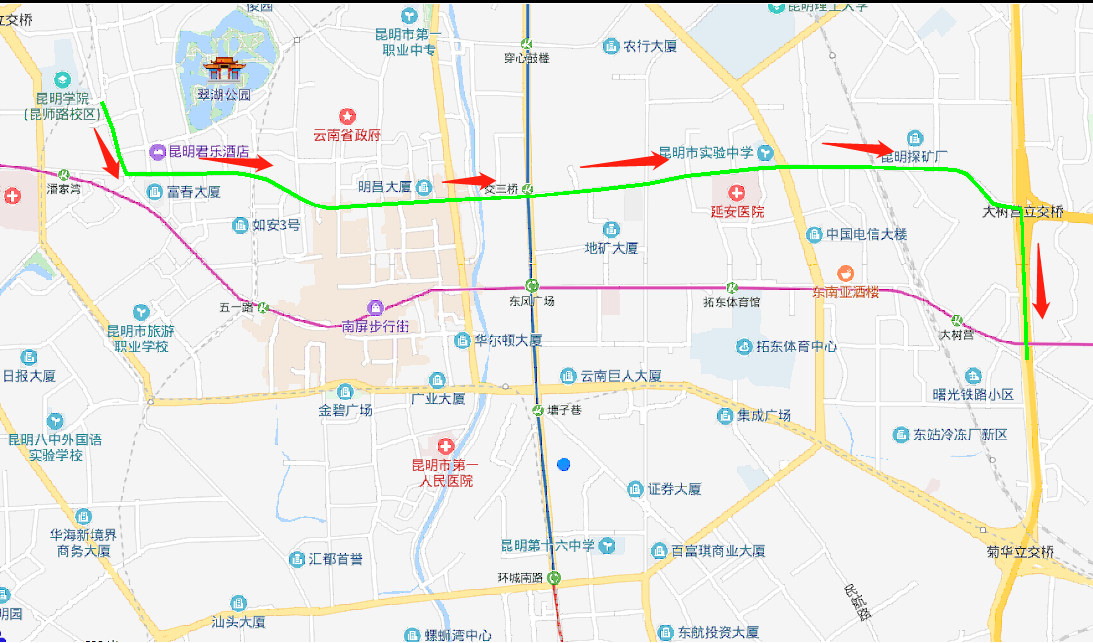 建议从昆师路→人民东路→金马立交桥,行车线路如下图: