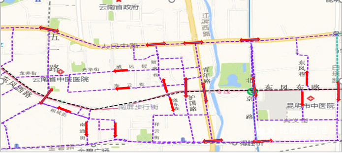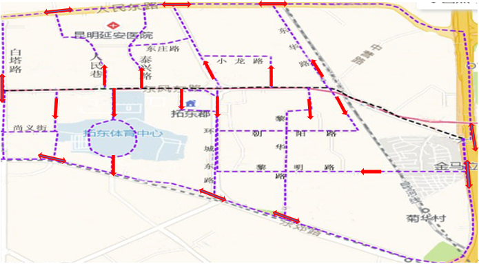 施工期间,东风路上交通较为阻塞,为保障片区交通正常进出,对片区交通进行分流引导,路线图如下所示: