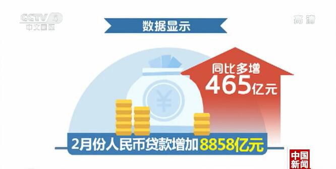 中国人民银行3月10日发布金融统计数据显示,2019年前两个月中国人民币贷款增加4.11万亿元。其中,2月当月人民币贷款增加8858亿元。
