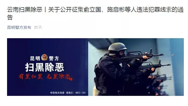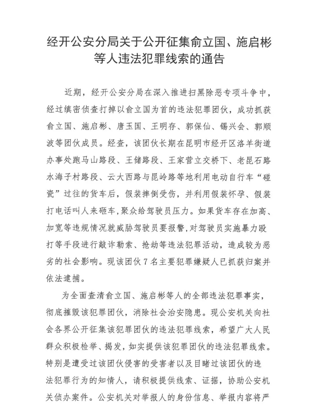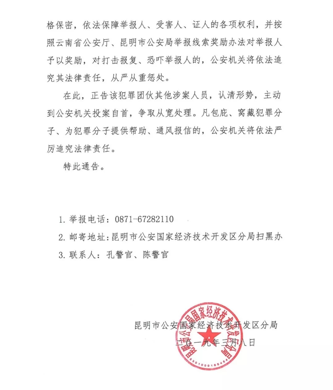 邮寄地址:昆明市公安局国家经济技术开发区分局扫黑办