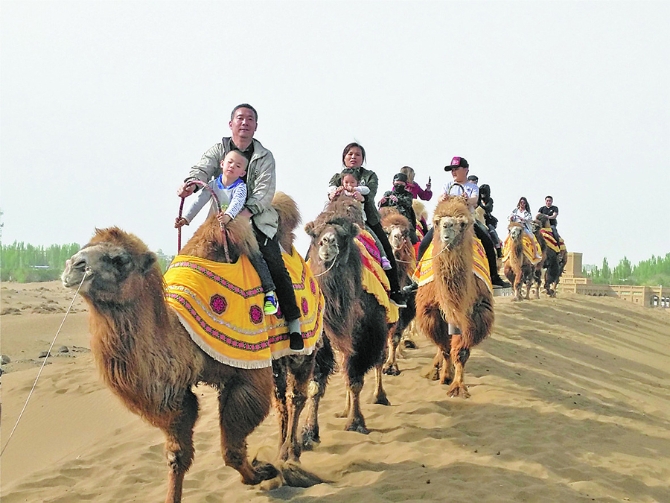 2018年4月7日,鄯善县库木塔格沙漠风景区,游客兴致盎然地骑骆驼游览。张月灵/摄