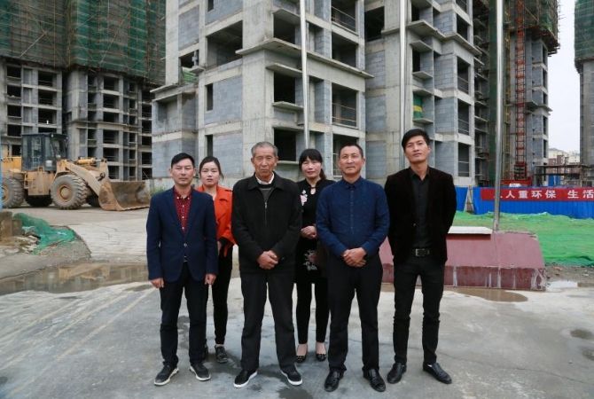 这是晏传忠(前排左二)一家在工地上的照片(合影时二儿子晏家勇不在场。照片由黄久生提供)
