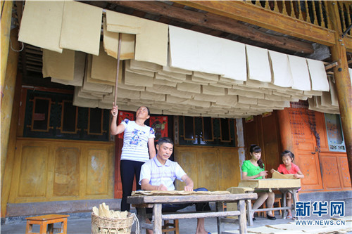 村民在晾晒成批的手抄纸。新华网发 高登泽/摄