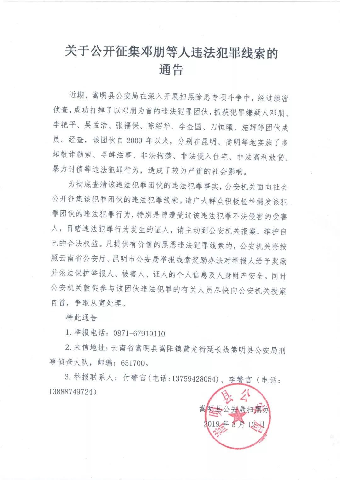 近期,嵩明县公安局在深入开展扫黑除恶专项斗争中,经过缜密侦查,成功打掉了以邓朋为首的违法犯罪团伙,抓获犯罪嫌疑人邓朋、李艳平、吴孟浩、张福保、陈绍华、李金国、刀恒曦、施辉等团伙成员。经查,该团伙自2009年以来,分别在昆明、嵩明等地实施了多起敲诈勒索、寻衅滋事、非法拘禁、非法侵入住宅、非法高利放贷、暴力讨债等违法犯罪行为,造成了较为严重的社会影响。