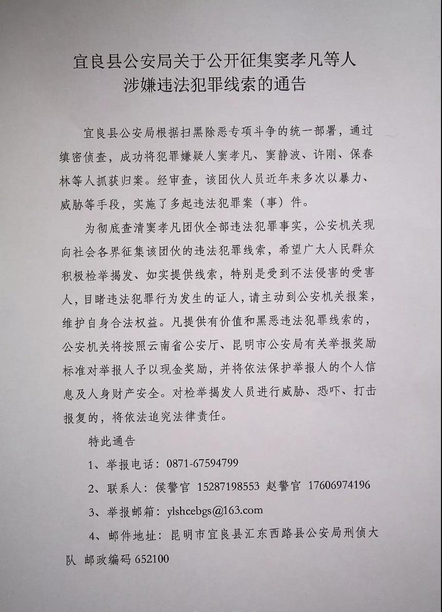 宜良县公安局关于公开征集窦孝凡等人涉嫌违法犯罪线索的通告