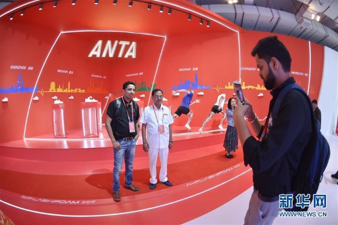 在一年一度的中国(晋江)国际鞋业暨国际体育产业博览会上,来自印度的客商在安踏展位前留影(2018年4月19日摄)。新华社 记者宋为伟/摄