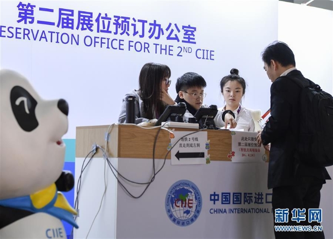 在第二届中国国际进口博览会展位预订办公室,一名来自马来西亚的客商(右一)申请预订展位(2018年11月10日摄)。新华社 记者李贺/摄