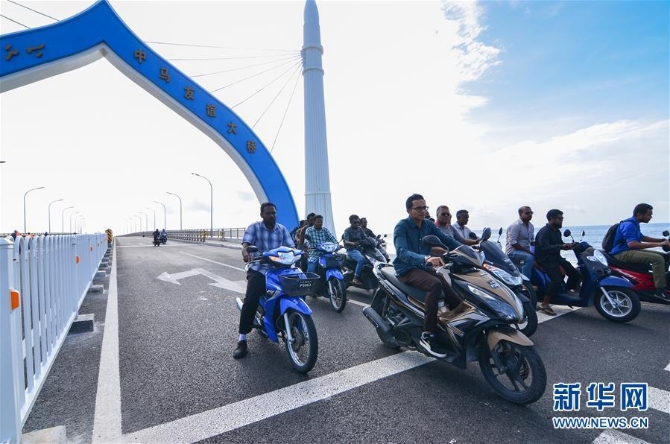 在连接马尔代夫首都马累和机场岛的中马友谊大桥上,当地居民在桥头等待通行(2018年10月8日摄)。新华社发 杜才良/摄