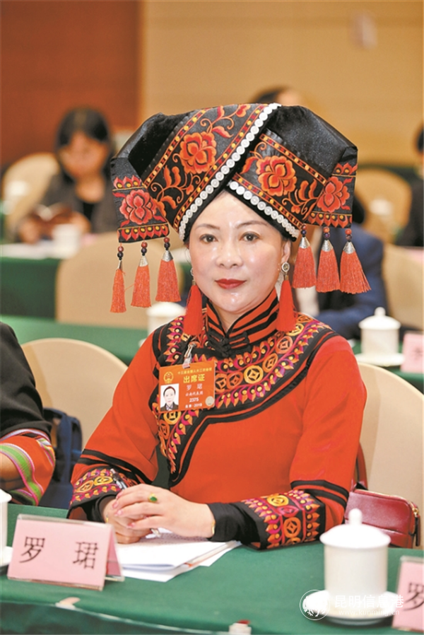 “我是‘非遗’传承人,也是产业带头人。”全国人大代表、彝族绣娘罗珺说。她身着黑底赤绣的彝族服饰,头饰上的缨络摇曳生姿,精致艳丽的花朵逼真得仿佛透着花香。