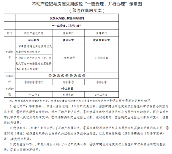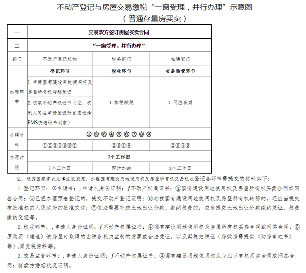 根据《通知》规定,各地不动产登记机构、住建部门、税务部门必须进驻同一个服务大厅,设置综合受理窗口,将不动产登记和房屋交易监管、缴税所需的法定材料编制形成统一的申请材料目录向社会公布,实行“一次取号、一套资料、一窗受理”。