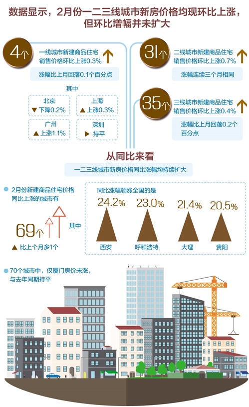 “2月份,一线和三线城市新建商品住宅、二手住宅销售价格环比微涨;二线城市新建商品住宅销售价格环比上涨,二手住宅环比下降。”刘建伟说。
