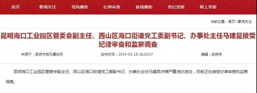 昆明海口工业园区管委会副主任、西山区海口街道党工委副书记、办事处主任马建昆涉嫌严重违纪违法,目前正在接受纪律审查和监察调查。