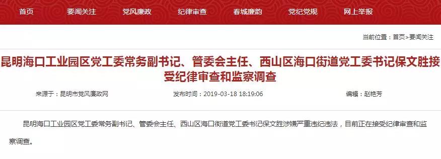 昆明海口工业园区党工委常务副书记、管委会主任、西山区海口街道党工委书记保文胜涉嫌严重违纪违法,目前正在接受纪律审查和监察调查。