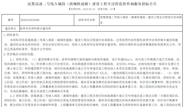 公告显示,该工程受昆明市政府委托,昆明市住房和城乡建设局建设,建设资金来自政府投资,项目出资比例为100%。全线包括改建一座部分互通立交(黄土坡立交)和新建四根平行匝道,相应的地面滇缅大道公交专用道改造工程也纳入本项目实施范围。本项目包括道路、排水、桥梁、交通、绿化、照明和等主要工程内容。建安投资约15.7亿元,总投资约27.5亿元。