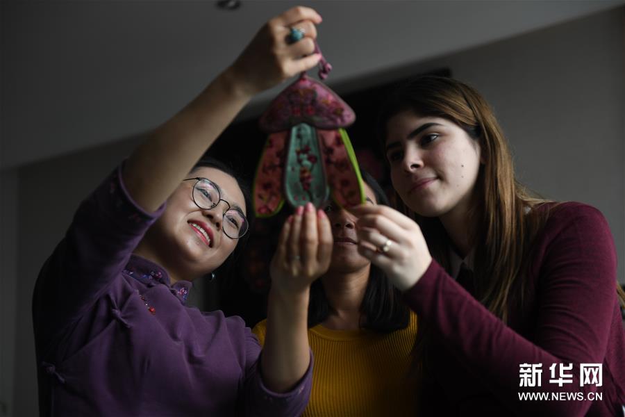 3月14日,在位于苏州吴中区光福镇的向红绣府刺绣艺术工作室,府涵璐在指导巴拿马留学生玛利娅(左)、陆惠芳(右)刺绣。