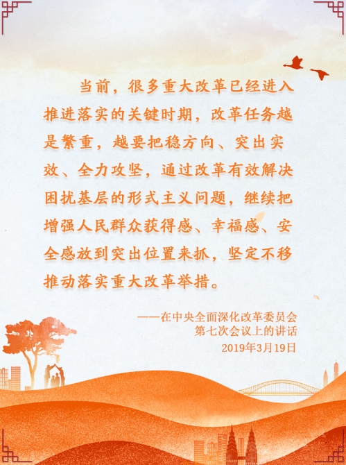 2019年3月19日,习近平主持召开中央全面深化改革委员会第七次会议并发表重要讲话,强调“继续把增强人民群众获得感、幸福感、安全感放到突出位置来抓,坚定不移推动落实重大改革举措”。
