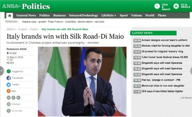 意大利安莎通讯社3月15日报道,意大利副总理、劳工和工业部长路易吉·迪马约(Luigi Di Maio)表示,意大利将与中国签署的基础设施倡议旨在创建一条现代丝绸之路,会加强而不是削弱意大利的主权。迪马约在与意大利总理孔特(Giuseppe Conte)和其他政府高级官员会晤后表示:“这不是与中国的政治协议,而是一个贸易机会。”