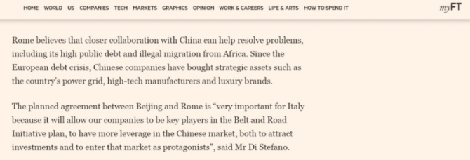 英国路透社3月18日也报道称,意大利的港口是通往欧洲最富裕市场的便捷门户,意大利政府希望通过参与“一带一路”,能促进本国出口与投资,帮助疲弱的经济摆脱10年来的第三次衰退。