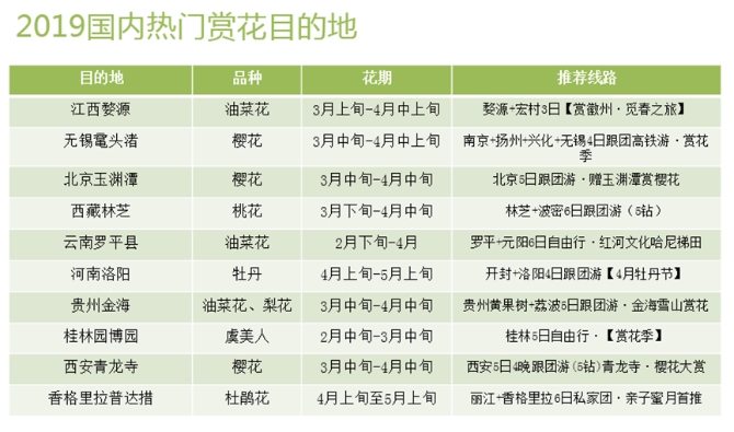 数据显示,江西婺源、无锡鼋头渚、北京玉渊潭、西藏林芝、云南罗平、河南洛阳、贵州金海、桂林园博园、西安青龙寺、香格里拉普达措,是国内人气上升最快的热门赏花游目的地。
