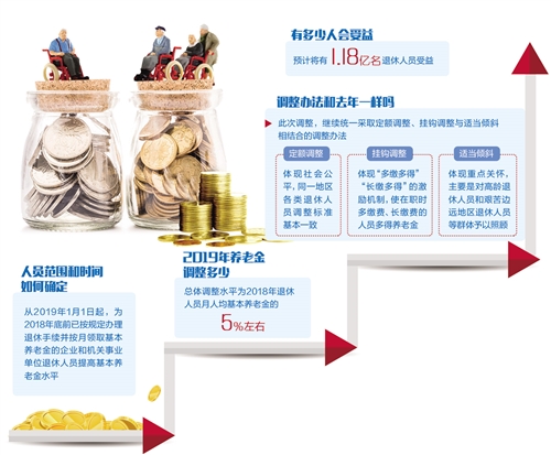 2019年养老金待遇能提高多少?这是退休人员普遍关心的话题。按照通知规定,2019年总体调整比例与2018年持平,即总体调整水平为2018年退休人员月人均基本养老金的5%左右。