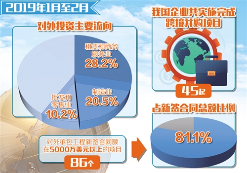 与此同时,跨境并购稳步发展。前两个月,我国企业共实施完成跨境并购项目45起,分布在英国、马来西亚等22个国家和地区,涉及制造业、金融业、租赁和商务服务业等12个行业大类,实际交易总额24.8亿美元,其中直接投资18.5亿美元。对外承包工程大项目多,带动当地发展作用明显。前两个月,对外承包工程新签合同额在5000万美元以上的项目86个,占新签合同总额的81.1%。对外承包工程完成营业额主要集中在交通运输建设和电力工程建设行业,合计占比超过60%,有效改善了东道国基础设施条件。(经济日报)