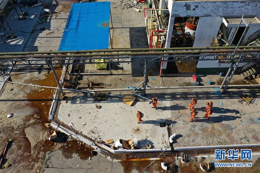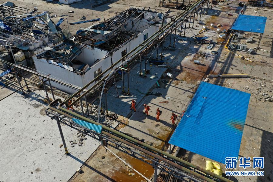 3月22日,消防队员在江苏盐城响水化工厂爆炸事故现场搜救(无人机拍摄)。 新华社记者 季春鹏 摄
