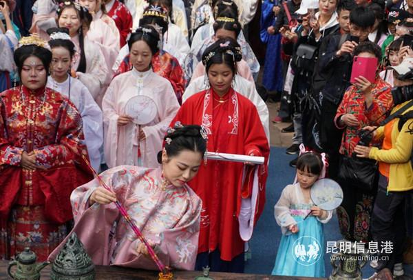 今年第四届金殿花朝节以“月夕花朝·古礼祭花神”为主题,活动当天,凡穿汉服者免票入园,让游客得以近距离亲身感受花朝节及汉文化的独特魅力,延续传统文化的当代内涵,大力弘扬复兴中华优秀传统文化。据悉,启幕当天,有超过2000名汉服爱好者齐聚金殿,为市民和游客献上一场传统文化盛宴。