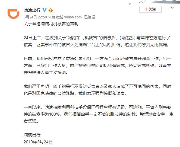 以下为滴滴出行关于常德滴滴司机被害的声明