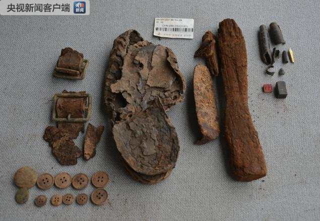 其他遗物:鞋底1只、纽扣1个、皮带扣1个、破损玻璃片1个。
