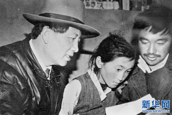 在西藏工作期间,孔繁森(左)在辅导藏族儿童读书(资料照片)。新华社发