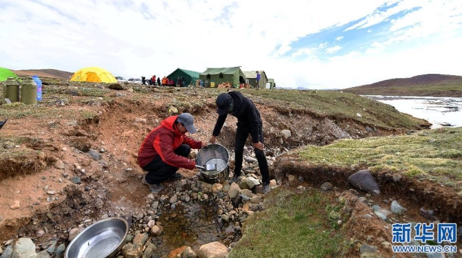 科研人员和后勤人员从营地前的小溪取生活用水(2017年6月24日摄)。新华社记者 晋美多吉 摄