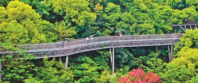 钢架镂空设计,依山脊而建,漫步其中,让人感觉仿佛在森林上空行走——这条名为“福道”的城市森林步道,主轴线长约6.3公里,环线总长约19公里,串起福州五大公园,已成为福州的一张名片。