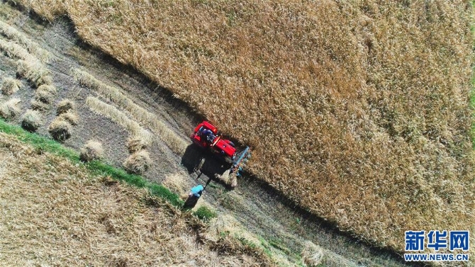 西藏定日县农民在收割青稞(2018年9月13日无人机拍摄)。新华社记者 普布扎西 摄