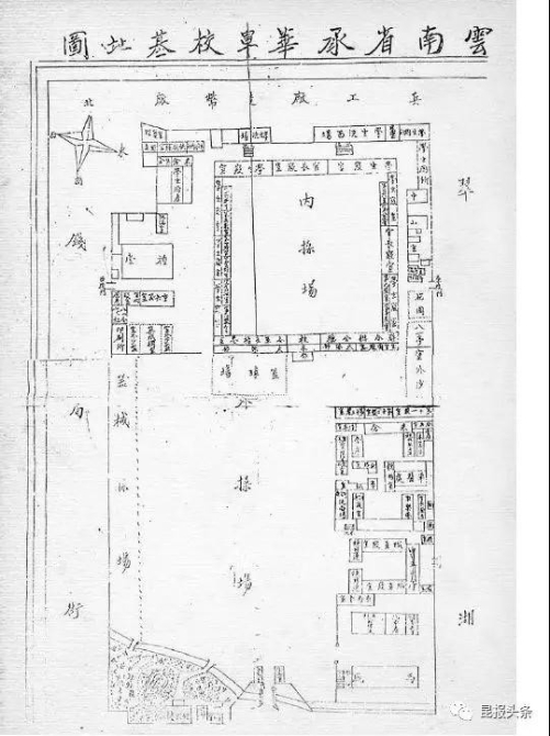 从翠湖远观云南陆军讲武堂博物馆,可见这是一座极其标准而规模可称为中国最大的“走马转角”式的建筑,从高处鸟瞰,它的造型似乎又与昆明典型的“一颗印”式的民居十分相似。