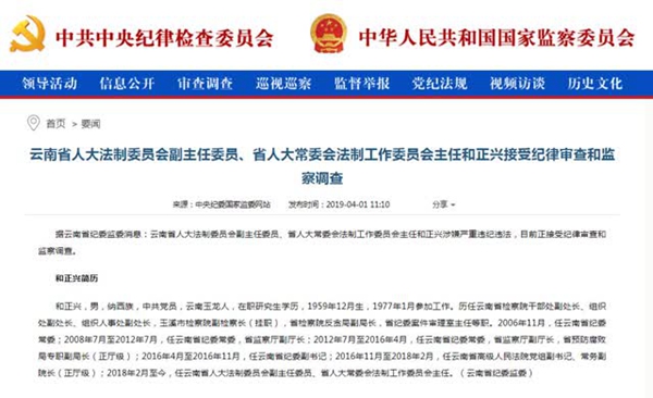 据云南省纪委监委消息:云南省人大法制委员会副主任委员、省人大常委会法制工作委员会主任和正兴涉嫌严重违纪违法,目前正接受纪律审查和监察调查。