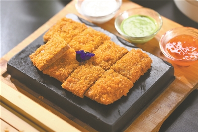 “豆排”可以媲美荤菜餐厅中的牛排,它冠以“排”的概念,也拥有“排”的气场。那豆排是啥?其实就是黄豆熬制后加入香芋等做成的食物,厨师有意将它做出一定的厚度,裹上面包糠和面粉后,更具神秘感。实际上,不道明真相,也许有一大波人不知道这究竟是啥。香芋的味道香浓,大有牛奶风味。