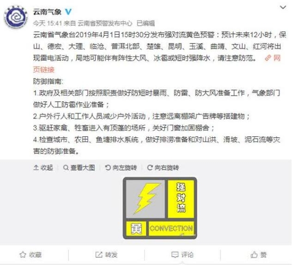 另外,云南省气象台4月1日15时30分发布强对流黄色预警:预计未来12小时,保山、德宏、大理、临沧、普洱北部、楚雄、昆明、玉溪、曲靖、文山、红河将出现雷电活动,局地可能伴有阵性大风、冰雹或短时强降水,请注意防范。
