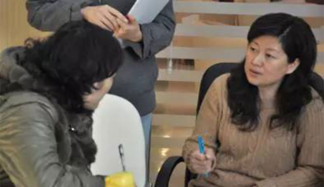 每周三的义诊,尤欣(右)在为自闭症家长解答病情。(新华网)