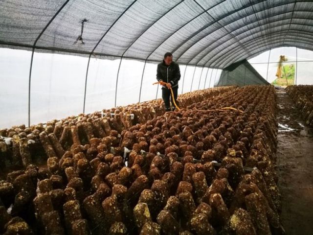 大林镇李家坝村村民在大棚里管护香菇(2017年2月13日摄)。四川南充大林镇李家坝村前党支部书记李和林在查出胃癌后仍坚持工作,为村里建起食用菌产业园,在岗位上与死神赛跑到最后一刻。新华社 记者陈地/摄