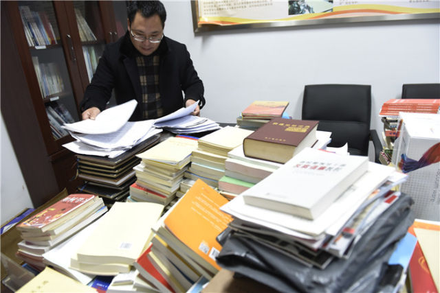 四川乐山市公路管理局工作人员在公路管理局原党委书记、局长王川的办公室整理书籍和文件(2017年2月13日摄)。王川在实地勘察小凉山精准扶贫交通项目时,突遇山岩崩塌,与其他6位同事殉职,年仅53岁。新华社 记者刘坤/摄