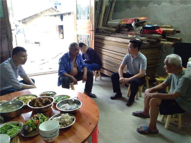 结束了一天的繁忙工作,蓝标河匆匆从县城赶往同仕村,手里拎着鸡肉、猪蹄等熟食,叫上几个村民,走进村民黄永礼家,围坐在一起边吃边聊: