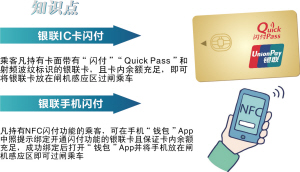 银联闪付包括银联IC卡闪付和银联手机闪付,银联IC卡闪付是指乘客凡持有卡面带有“闪付”“Quick Pass”和射频波纹标识的银联卡且卡内余额充足,即可将银联卡放在闸机感应区过闸乘车;银联手机闪付是指凡持有NFC闪付功能的乘客,可在手机“钱包”App中照提示绑定开通闪付功能的银联卡且保证卡内余额充足,成功绑定后打开“钱包”App并将手机放在闸机感应区即可过闸乘车。