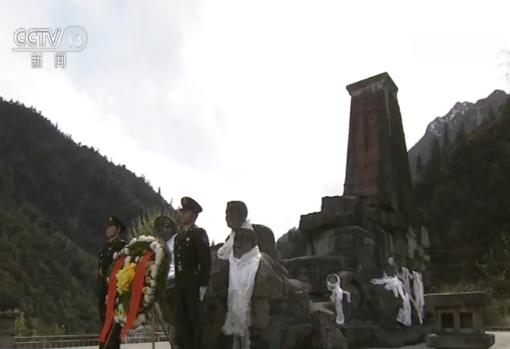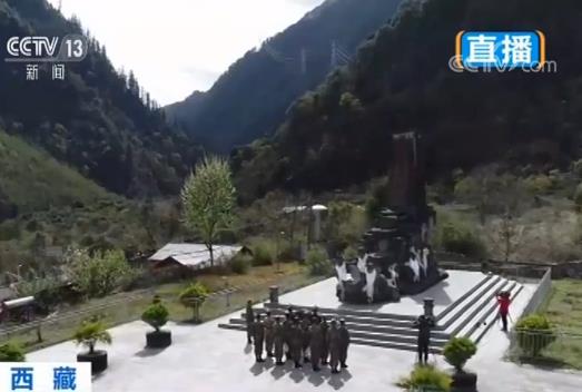 “山崩地裂无所惧,越是艰险越向前”。现在看到的是位于川藏公路通麦段的“川藏运输线上十英雄”纪念碑。今天,驻守在这里的川藏兵站部 通麦兵站官兵们,手捧着鲜花和哈达,向英雄们致敬。